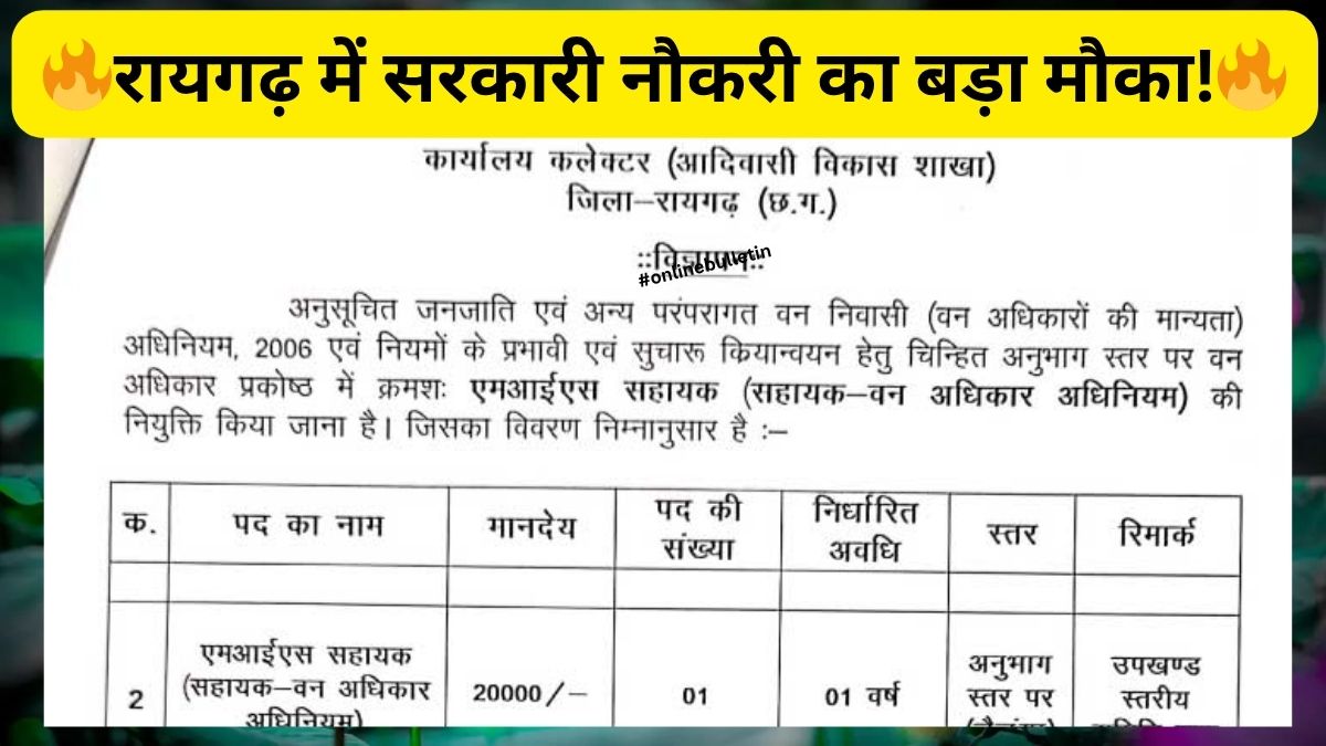 CG TWD Raigarh Recruitment 2026:┬ардЫрддреНрддреАрд╕рдЧрдврд╝ рдореЗрдВ рд╕рд░рдХрд╛рд░реА рдиреМрдХрд░реА рдХреА рддрд▓рд╛рд╢ рдХрд░ рд░рд╣реЗ рдпреБрд╡рд╛рдУрдВ рдХреЗ рд▓рд┐рдП рдПрдХ рд╢рд╛рдирджрд╛рд░ рдЦрдмрд░ рд╕рд╛рдордиреЗ рдЖрдИ рд╣реИред рдЖрджрд┐рд╡рд╛рд╕реА рд╡рд┐рдХрд╛рд╕ рд╡рд┐рднрд╛рдЧ рд░рд╛рдпрдЧрдврд╝ рдиреЗ рд╡рд░реНрд╖ 2026 рдХреЗ рд▓рд┐рдП рдПрдордЖрдИрдПрд╕ рд╕рд╣рд╛рдпрдХ (MIS Assistant) рдХреЗ рдкрдж рдкрд░ рднрд░реНрддреА рдХрд╛ рдиреЛрдЯрд┐рдлрд┐рдХреЗрд╢рди рдЬрд╛рд░реА рдХрд┐рдпрд╛ рд╣реИред рдЦрд╛рд╕ рдмрд╛рдд рдпрд╣ рд╣реИ рдХрд┐ рдпрд╣ рднрд░реНрддреА рд╕рдВрд╡рд┐рджрд╛ рдЖрдзрд╛рд░ рдкрд░ рд╣реЛрдЧреА рдФрд░ рдЗрд╕рдореЗрдВ рд╕рд┐рд░реНрдл 01 рдкрдж рдЙрдкрд▓рдмреНрдз рд╣реИ тАФ рдпрд╛рдиреА рдкреНрд░рддрд┐рдпреЛрдЧрд┐рддрд╛ рдХрд╛рдлреА рддрдЧрдбрд╝реА рд░рд╣рдиреЗ рд╡рд╛рд▓реА рд╣реИред