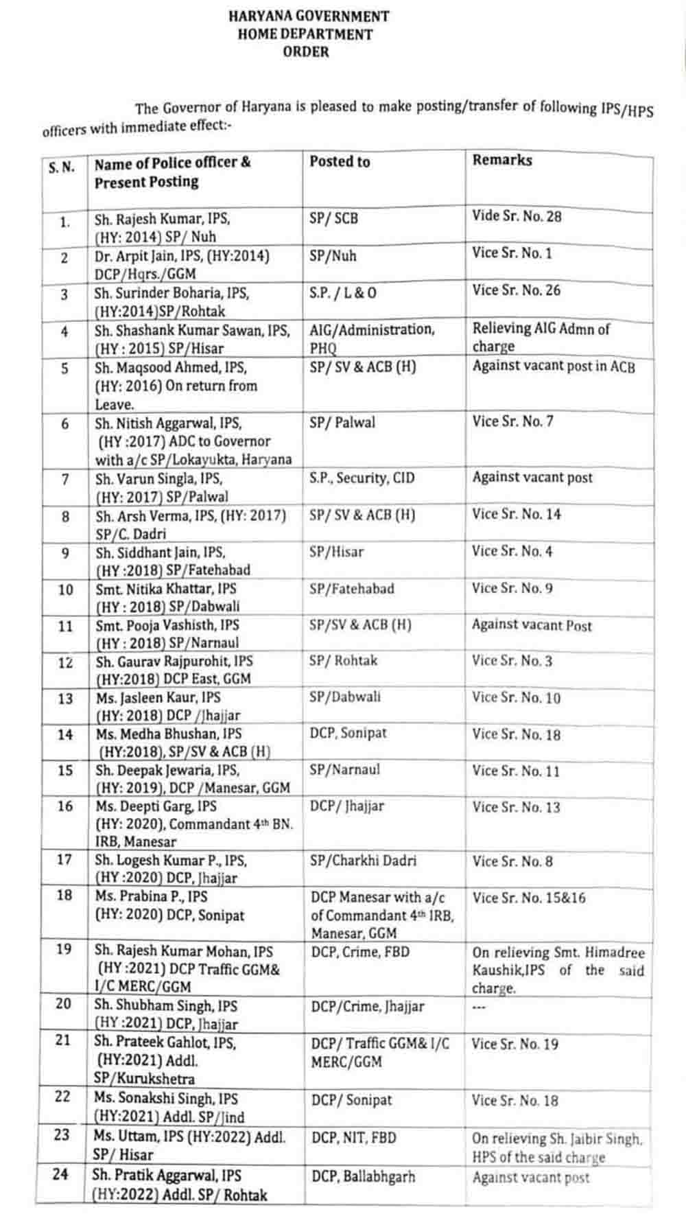 हरियाणा सरकार ने बृहस्पतिवार रात को पुलिस प्रशासन में व्यापक फेरबदल किया है। प्रदेश सरकार ने 24 आइपीएस और पांच एचपीएस अधिकारियों के तबादले किए। नूंह, हिसार, रोहतक, पलवल, चरखी दादरी, फतेहाबाद, डबवाली और नारनौल के जिला पुलिस अधीक्षकों को बदलकर उनके स्थान पर नई नियुक्तियां की गई हैं।