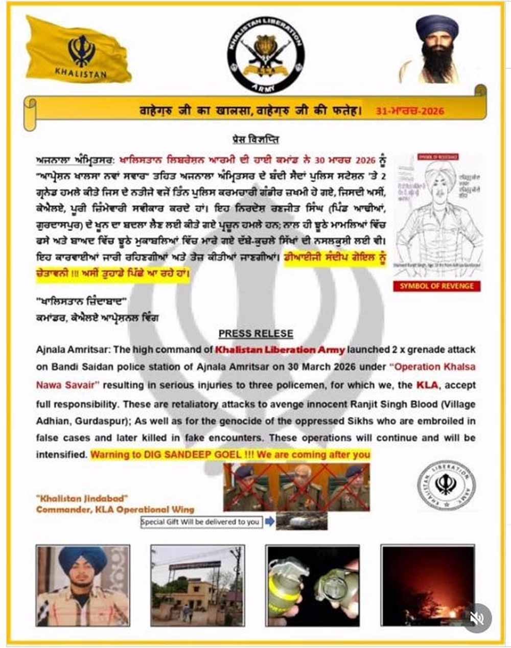ये हमले निर्दोष रणजीत सिंह (गुरदासपुर के गांव अधियां) के खून का बदला लेने के लिए किए गए हैं, साथ ही उन पीड़ित सिखों के लिए भी, जो झूठे मामलों में फंसाए गए और बाद में झूठे एनकाउंटर में मारे गए। ये कार्रवाई आगे भी जारी रहेंगी और इन्हें और तेज किया जाएगा। डीआईजी संदीप गोयल को चेतावनी! हम तुम्हारे पीछे आ रहे हैं। इसके साथ ही खालिस्तान जिंदाबाद भी लिखा गया।