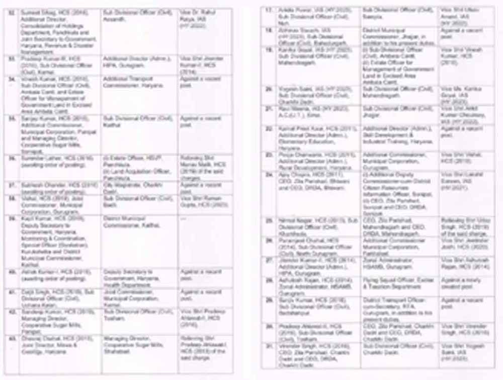 वंदना डिसोदिया को गृह विभाग में अतिरिक्त सचिव के साथ हरियाणा अनुसूचित जाति वित्त एवं विकास निगम की प्रबंध निदेशक बनाया गया है। जयदीप कुमार को पब्लिक हेल्थ इंजीनियरिंग विभाग में अतिरिक्त सचिव लगाया गया है। लक्षित सरीन को हांसी में एडीसी-कम-डीसीआरआईओ के साथ जिला नगर आयुक्त की जिम्मेदारी दी गई है।